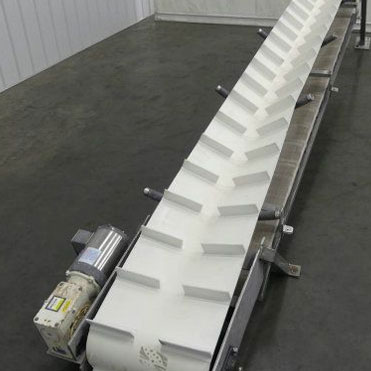 Inclined cleated belt conveyor handles bags, boxes, cartons, and parts. It may be set at any angle from horizontal to 45 degrees for various uses, including floor-to-floor conveying and the transportation of materials from building to truck or box car. Move products between floors, from floors to mezzanines, or to overhead conveyor lines and other areas where a items must be conveyed at an angle.